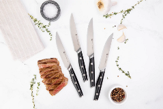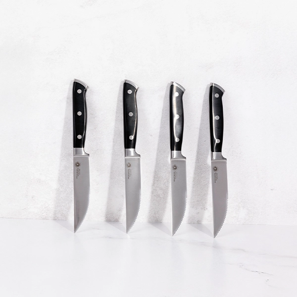 Diseñados especialmente para cortes de carne y proteínas a la parrilla, son el complemento perfecto para tus asados. Tienen un filo liso y una punta dentada. La hoja es muy resistente y conserva su filo durante más tiempo. El mango ergonómico de resina facilita sujetarlos con comodidad y firmeza. Fabricados con una aleación de acero inoxidable de la más alta calidad y respaldados con una garantía limitada de hasta 50 años.