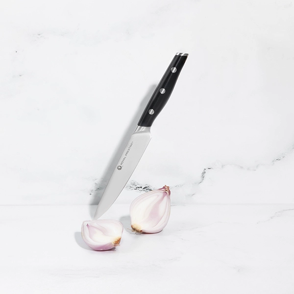 El Royal Prestige® Utility Knife es una versión más pequeña del famoso Royal Prestige® Chef’s Knife. Te ayudará a cortar y picar los ingredientes más pequeños con mayor facilidad para preparar tus recetas favoritas. Su versatilidad no tiene igual y su mango favorece un agarre profesional de manera más cómoda, lo que reduce la fatiga al usarlo por mucho tiempo. Sin duda este se volverá tu cuchillo favorito para el uso diario en la cocina.