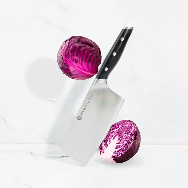 El Royal Prestige® Cleaver es una práctica hacha de cocina para cortar y picar alimentos. Su hoja es más ancha y pesada y te facilitará cualquier corte. Su renovado mango disminuye la fatiga y tiene el balance perfecto para que puedas controlarlo como los profesionales. Además, cuenta con un filo de fábrica sin igual.