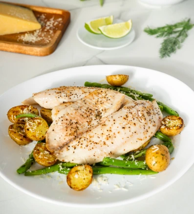 Sirve una base de papas baby al limón y eneldo con ejotes en cada plato.